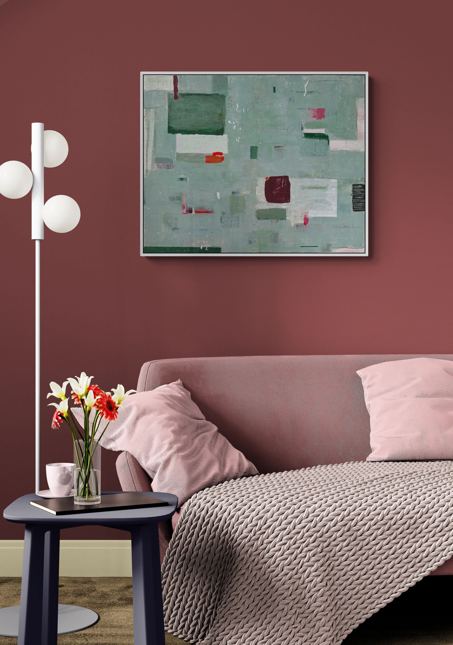 Mesmerising textures in pale greens with beautifully balanced accents in fuchsia, tangerine and maroon evoke a serene, reflective mood. This thoughtful composition of carefully arranged abstract shapes is a visual meditation on progress, layering, and renewal.