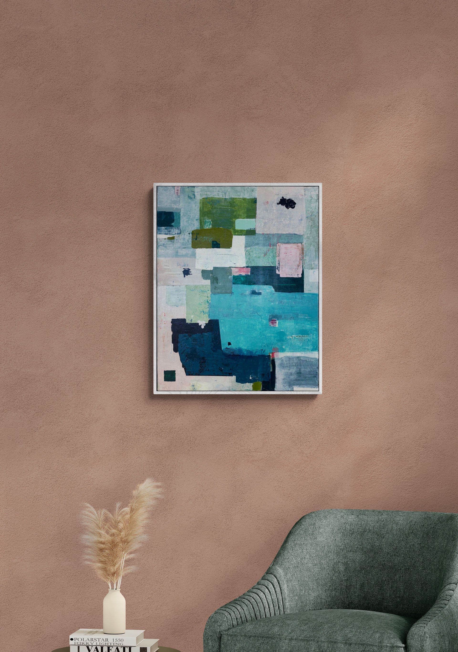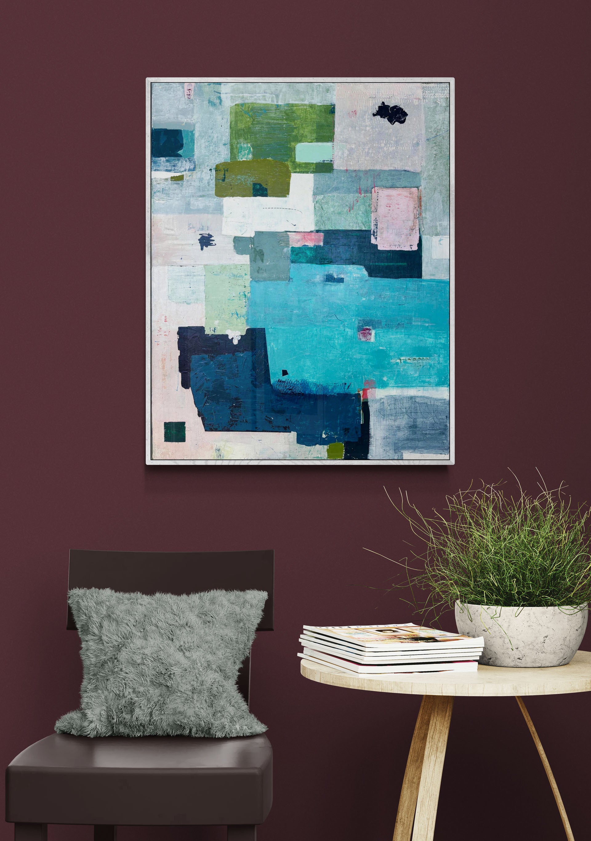 Original abstract painting. Acrylic paint and collage on gallery canvas. Measures approx. 61x76cm / 24x30in. Presented in a white floater frame.