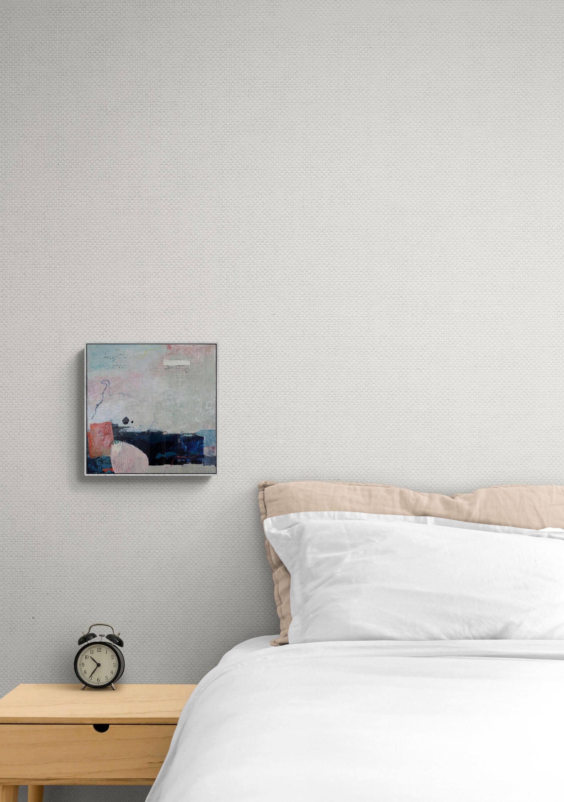 This sensitive, abstract landscape is an interpretation of layered, natural sceneries that moved me during recent travels to South Africa. Boulder shapes in delicate pink and coral hues contrast the mesmerising deep blues of the soft surf. Sweeping lines in accent pastels capture subtle movement and draw you into its serene rhythm, offering calm and depth to your space.